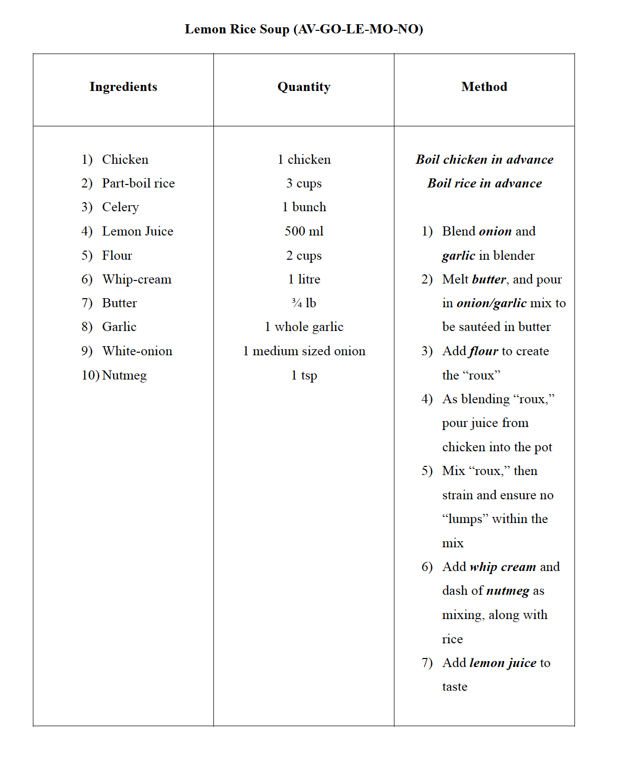 INGREDIENTS AND QUANTITY LIST